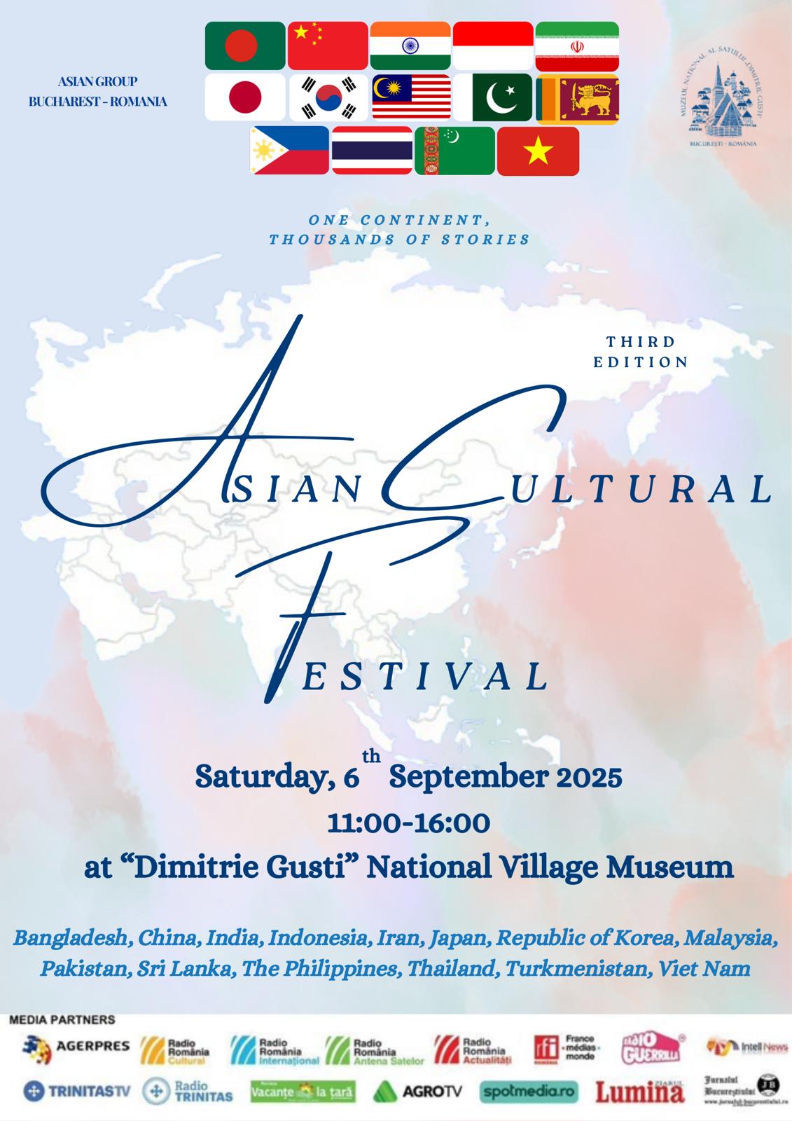 The Embassy of the Islamic Republic of Iran in Bucharest, together with the Embassies of Bangladesh, China, Indonesia, India, Japan, republic of Korea, Malaysia, Pakistan, the Philippines, Sri Lanka, Thailand, Turkmenistan and Vietnam, cordially invite you to the 3rd Asian Cultural Festival. The festival provides an opportunity to explore the rich cultural and artistic diversity of Asian countries, including artistic performances, cultural presentations, and traditional handicrafts exhibitions.