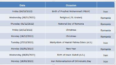 Official Holidays of Iran and Romania in the second half of 1401 (2022-2023)