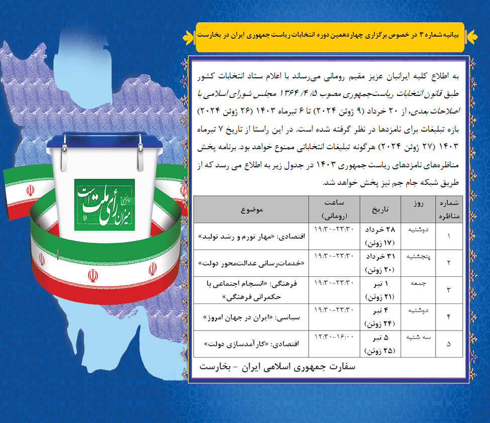 به اطلاع کلیه ایرانیان عزیز مقیم رومانی می‌رساند با اعلام ستاد انتخابات کشور طبق قانون انتخابات ریاست‌جمهوری مصوب ۵/ ۴/ ۱۳۶۴ مجلس شورای اسلامی‌با اصلاحات بعدی، از ۲۰ خرداد (9 ژوئن 2024) تا ۶ تیرماه ۱۴۰۳ (26 ژوئن 2024) بازه تبلیغات برای نامزدها در نظر گرفته شده است. در این راستا از تاریخ ۷ تیرماه 1403 (27 ژوئن 2024) هرگونه تبلیغات انتخاباتی ممنوع خواهد بود.