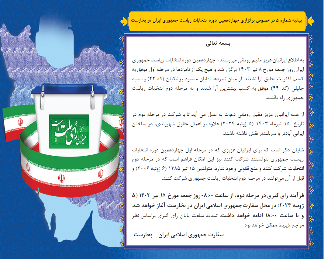 بیانیه شماره 5 در خصوص برگزاری چهاردهمین دوره انتخابات ریاست جمهوری ایران در بخارست